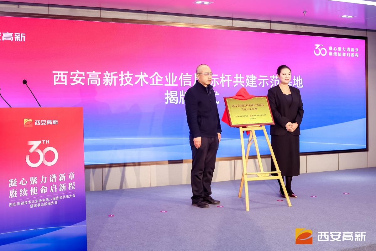 在随后召开的西安高新技术企业协会第八届会员代表大会期间,西安高新技术企业信用标杆共建示范基地揭牌仪式顺利举行。陕西省信用协会与西安高新技术企业协会携手,共同为示范基地揭牌,标志着双方以信用赋能科技创新、助力产业高质量发展的战略合作正式启动。
