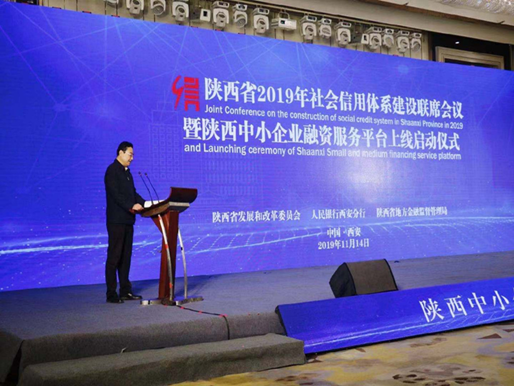 11月14日上午,陕西省2019年社会信用体系建设联席会议暨陕西中小企业融资服务平台上线仪式在西安人民大厦举行。省委常委、常务副省长梁桂莅临指导并出席平台启动仪式,省政府副秘书长夏晓中以及联席会议召集人——省发展改革委主任张晓光、人民银行西安分行行长魏革军出席会议,60家联席会议成员单位及各市(区)社会信用体系建设牵头部门负责同志参加会议,有关金融机构和企业代表应邀参加平台启动仪式,陕西省信用协会秘书长任洲全程参加会议。